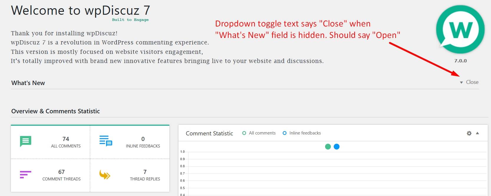 1. Your plugin's "What's New" dropdown toggle text always says "Close" -- whether field is opened or closed. See below image. Please review and fix.
