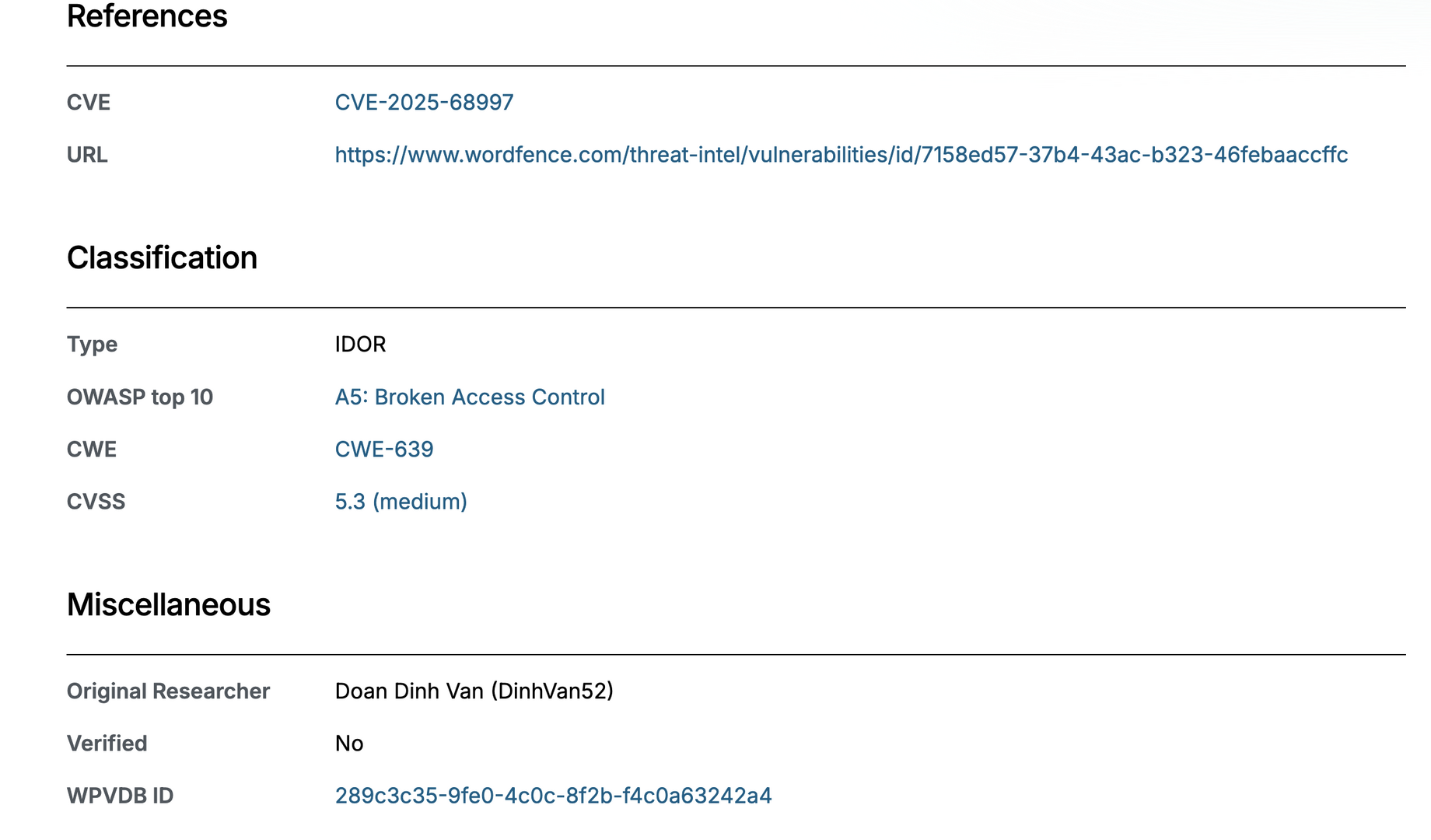 wpDiscuz plugin for WordPress is vulnerable to Insecure Direct Object Reference in all versions up to, and including, 7.6.42 due to missing validation on a user controlled key. This makes it possible for unauthenticated attackers to perform unauthorized actions.