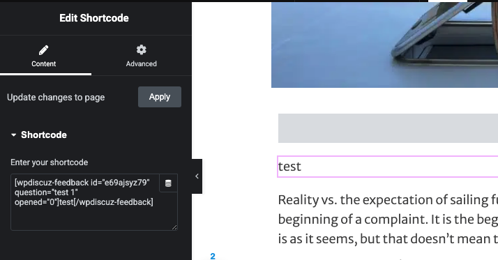 Hello! Having issues with Elementor rendering the shortcode from the feedback inline commenting feature. I am hoping someone can shed some light because I am at the end of what I know. It is not working so I am going to have to abandon this great idea, which I am super bummed about. Here's the deal. When I put the short code in an Elementor Shortcode Widget, it only renders the highlighted text. So on the front end, you only see the word 'test'. No errors in the console or network that I can see. I have unique ids, enabled native AJAX through wordpress which Elementor tells me can be an issue, posts & pages are enabled on forms, js exclusions on wprocket, Cloudflare is paused and nothing from Elementor. In a standard post, everything works fine. Please, if anybody has an idea, please share. Thanks everyone.